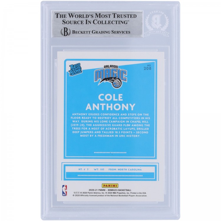 Cole Anthony Orlando Magic Autographed 2020-21 Panini Donruss Rated Rookie #208 Beckett Fanatics Witnessed Authenticated Rookie Card