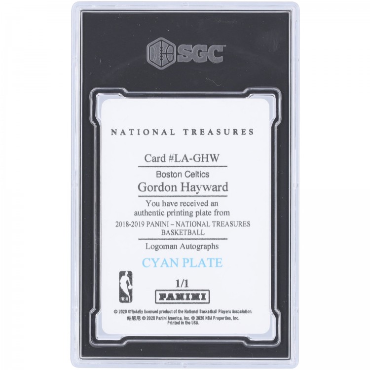 Gordon Hayward Boston Celtics 2018-19 Panini National Treasures Cyan Printing Plate #LA-GHW #1/1 SGC Authenticated Auth Card