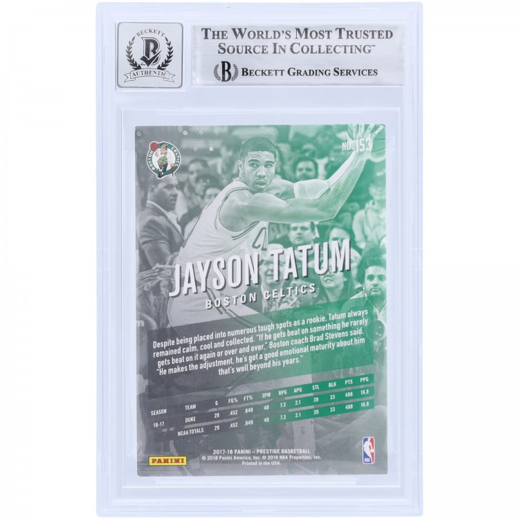 Jayson Tatum Boston Celtics Autographed 2017-18 Panini Prestige #153 Beckett Fanatics Witnessed Authenticated 9/10 Rookie Card