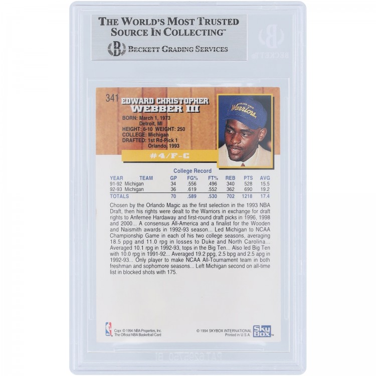 Chris Webber Golden State Warriors Autographed 1993-94 Skybox NBA Hoops #341 Beckett Fanatics Witnessed Authenticated Rookie Card