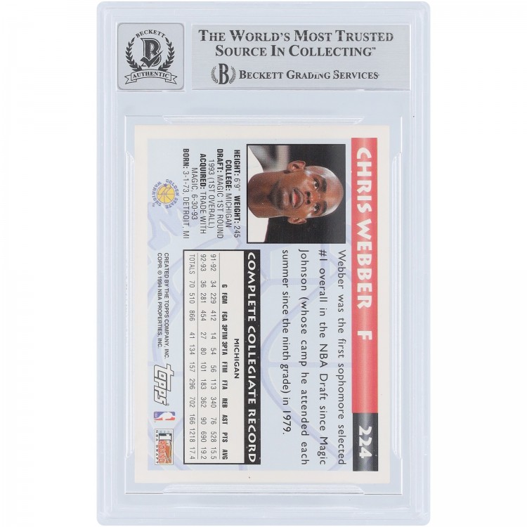 Chris Webber Golden State Warriors Autographed 1993-94 Topps #224 Beckett Fanatics Witnessed Authenticated 10 Rookie Card