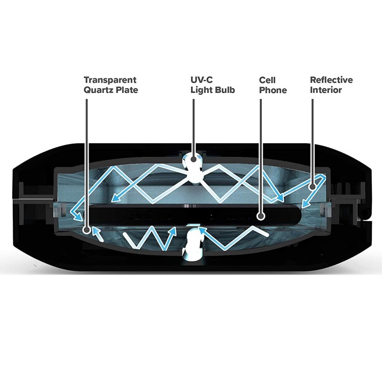 • Combination of chamber design, selective materials and bulb placement achieve 360-degree disinfection, reaching tiny crevices that sprays and wipes cannot