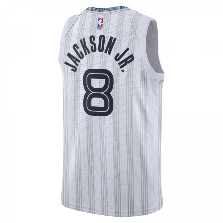 Rich in music history, Memphis is the birthplace of one of soul music's greatest record labels. The 2025/26 Memphis Grizzlies City Edition uniform celebrates the legacy of Stax Records, the life of Isaac Hayes, and the millions upon millions of Memphis records worldwide, highlighted by platinum record detailing, embossed design language and Grizzlies asymmetrical style This remixed version comes white background and platinum vertical stripes represent the groove - the platinum record status and vibe that Stax produced and the success of Memphis music delivered to the world. The ornate �MG� pattern, inspired by African Kente cloth, trims the neckband, short and left side panel of the uniform and has been recolored while continuing to represent Isaac's flair for fashion and his voice for social activism.