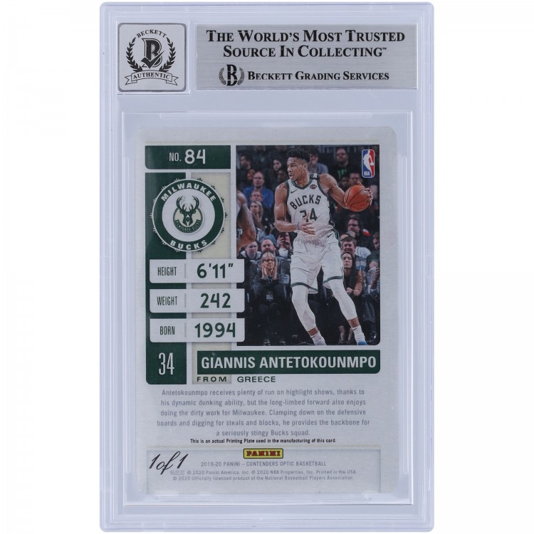 Giannis Antetokounmpo Milwaukee Bucks Autographed 2019-20 Panini Contenders Optic Printing Plate #84 #1/1 Beckett Fanatics Witnessed Authenticated 10 Card