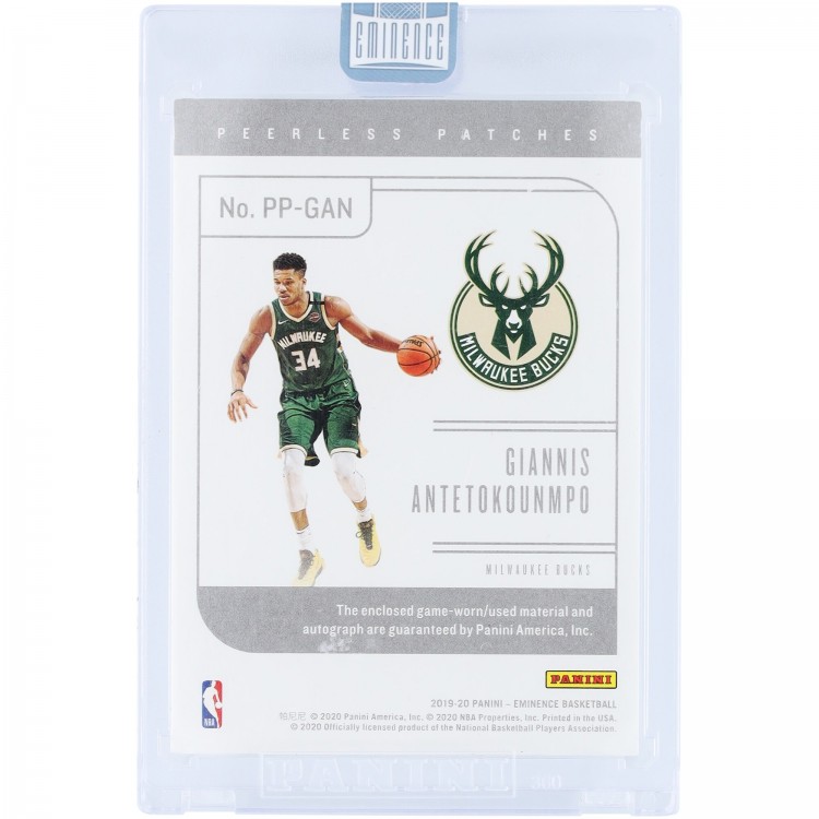 Giannis Antetokounmpo Milwaukee Bucks Autographed 2019-20 Panini Eminence Tri-Color Game-Used Relic #PP-GAN #1/10 Card