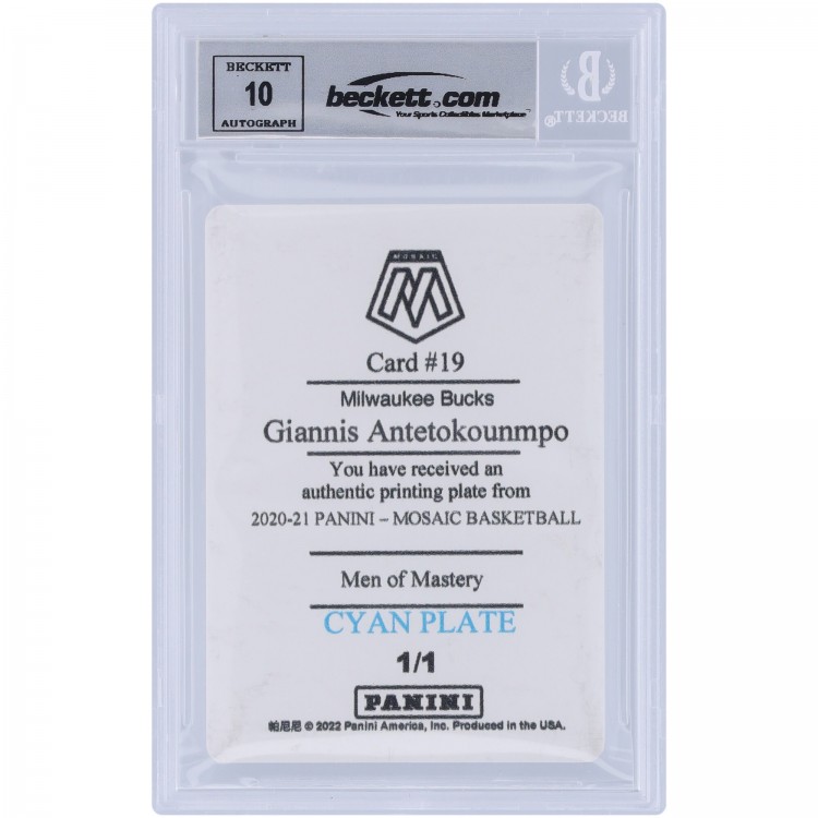 Giannis Antetokounmpo Milwaukee Bucks Autographed 2020-21 Panini Mosaic Printing Plate #19 #1/1 Beckett Fanatics Witnessed Authenticated 10 Card