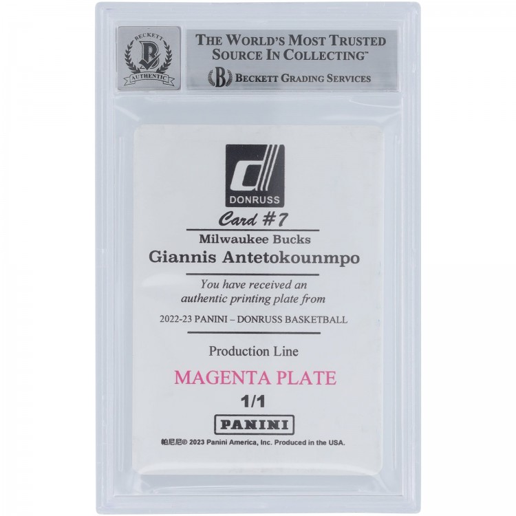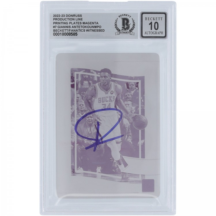 Giannis Antetokounmpo Milwaukee Bucks Autographed 2022-23 Donruss Production Line Magenta Printing Plate #7 #1/1 Beckett Fanatics Witnessed Authenticated 10 Card