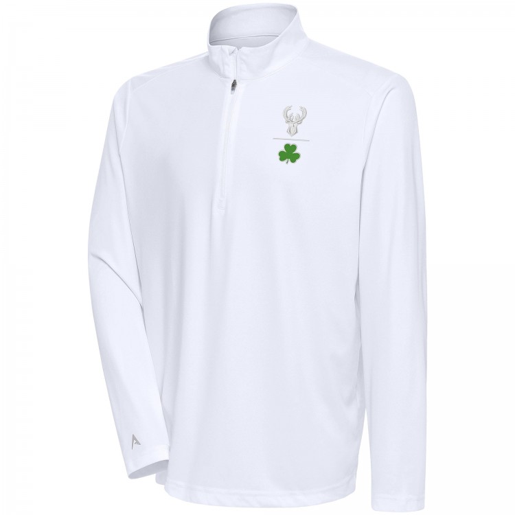 Milwaukee Bucks Antigua White Shamrock Tribute Quarter-Zip Pullover Top