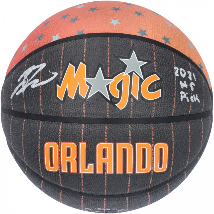 Autographed Orlando Magic Jalen Suggs Fanatics Authentic Wilson City Edition Collectors Basketball with 2021 #5 Pick Inscription