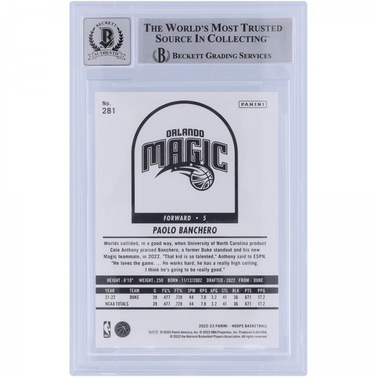 Paolo Banchero Orlando Magic Autographed 2022-23 Panini Hoops #281 Beckett Fanatics Witnessed Authenticated 9/10 Rookie Card