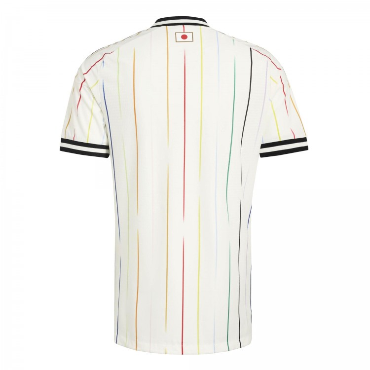 DESIGN DETAILS: A celebration of football unity and community. The 2026 Away jersey embodies the concept 'Colors Beyond the Horizon,' showcasing a striking stripe graphic with 12 different colors. Each hue represents a player, while the central red stripe symbolizes the bond of the Japanese soccer family, emphasizing that family is the foundation of the national team.