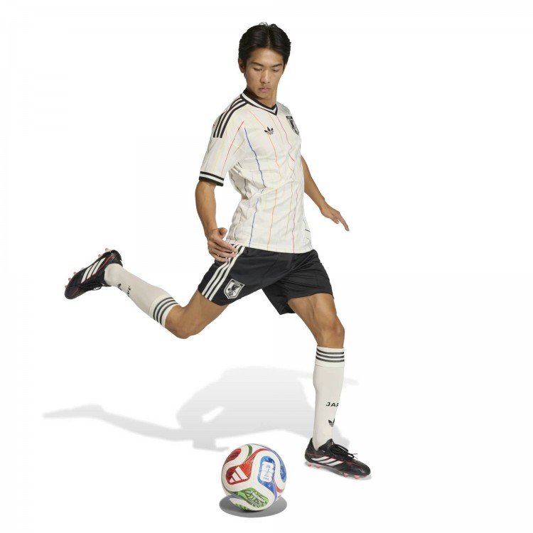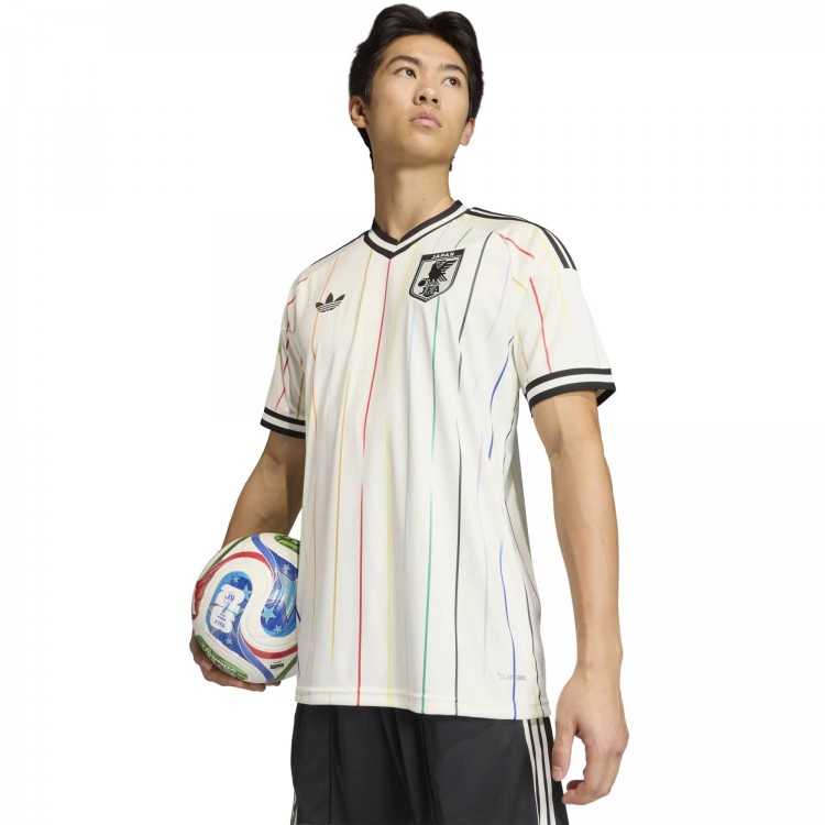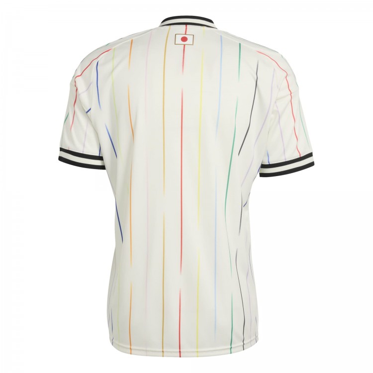 • DESIGN DETAILS: A celebration of football unity and community. The 2026 Away jersey embodies the concept 'Colors Beyond the Horizon,' showcasing a striking stripe graphic with 12 different colors. Each hue represents a player, while the central red stripe symbolizes the bond of the Japanese soccer family, emphasizing that family is the foundation of the national team.