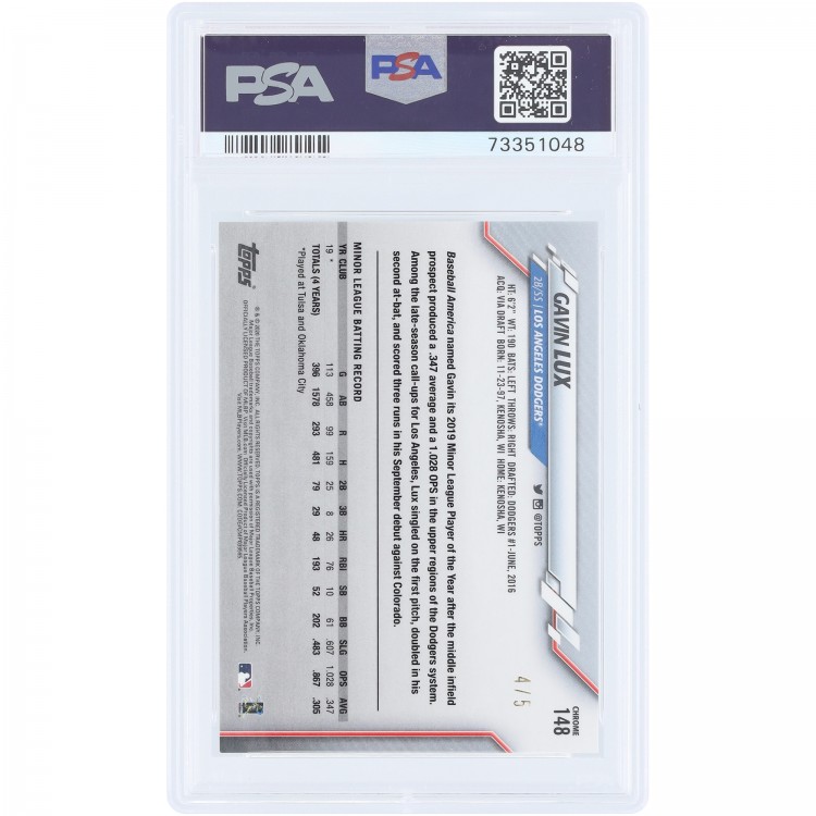 Gavin Lux Los Angeles Dodgers 2020 Topps Chrome Red Refractor #148 #4/5 PSA Authenticated 10 Rookie Card