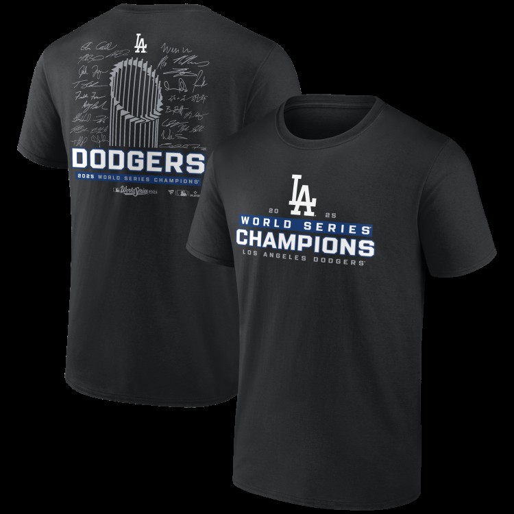 Los Angeles Dodgers Black 2025 World Series Champions Signature Roster T-Shirt