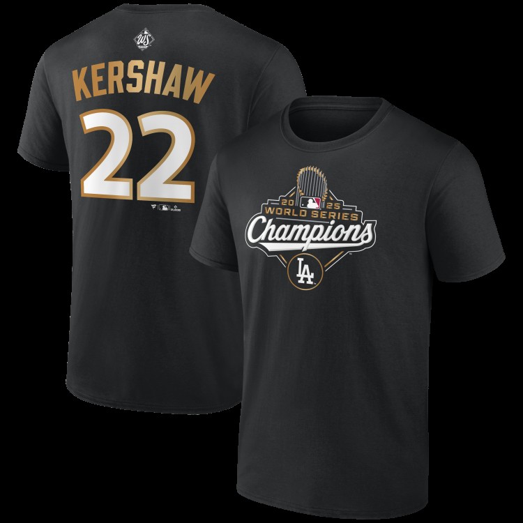 Los Angeles Dodgers Clayton Kershaw Fanatics Black 2025 World Series Champions Name & Number T-Shirt