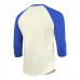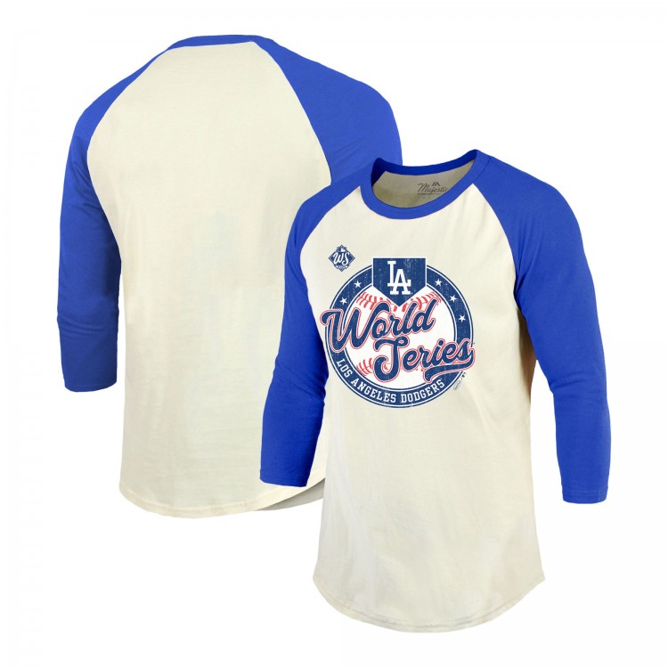 Los Angeles Dodgers Majestic Threads Cream/Royal 2025 World Series Softhand Tri-Blend 3/4 Sleeve Raglan T-Shirt