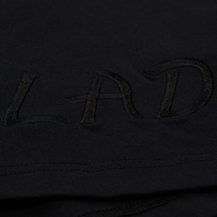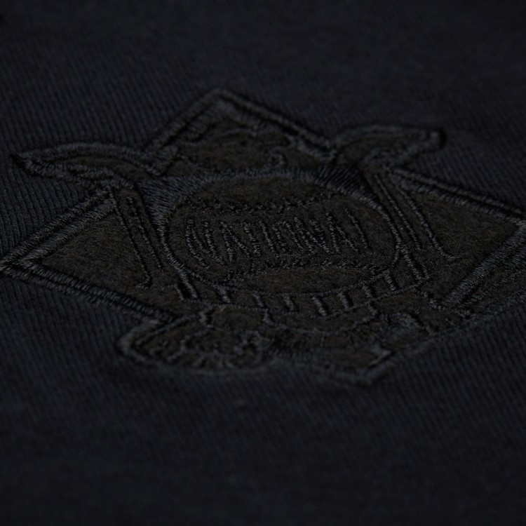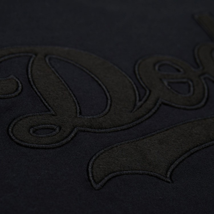 Tonal fabric applique graphics on front, logo on left sleeve and wordmark across the top back