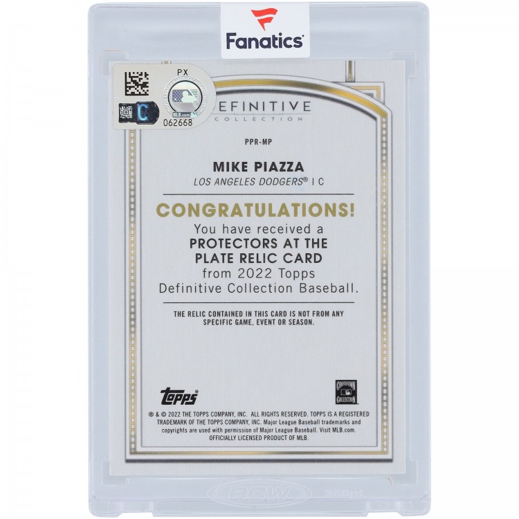 Mike Piazza Los Angeles Dodgers Autographed 2022 Topps Definitive Collection Protectors At The Plate Game-Used Relic #PPR-MP #1/25 BAS Letter Authenticated Card