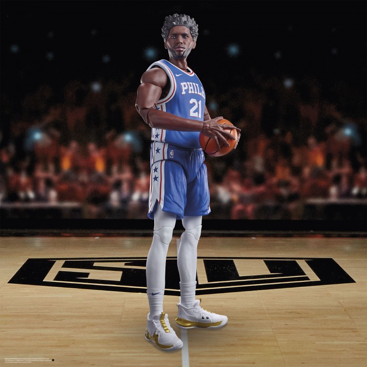 The Starting Lineup Series 1 Joel Embiid NBA action figure comes in his Philadelphia 76ers Icon Edition jersey, as well as his Embiid One Under Armour shoes