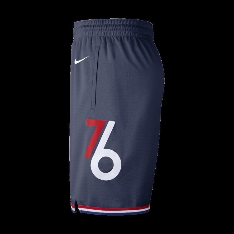 Heat-sealed team logo at bottom left leg and swingman logo at upper right hip